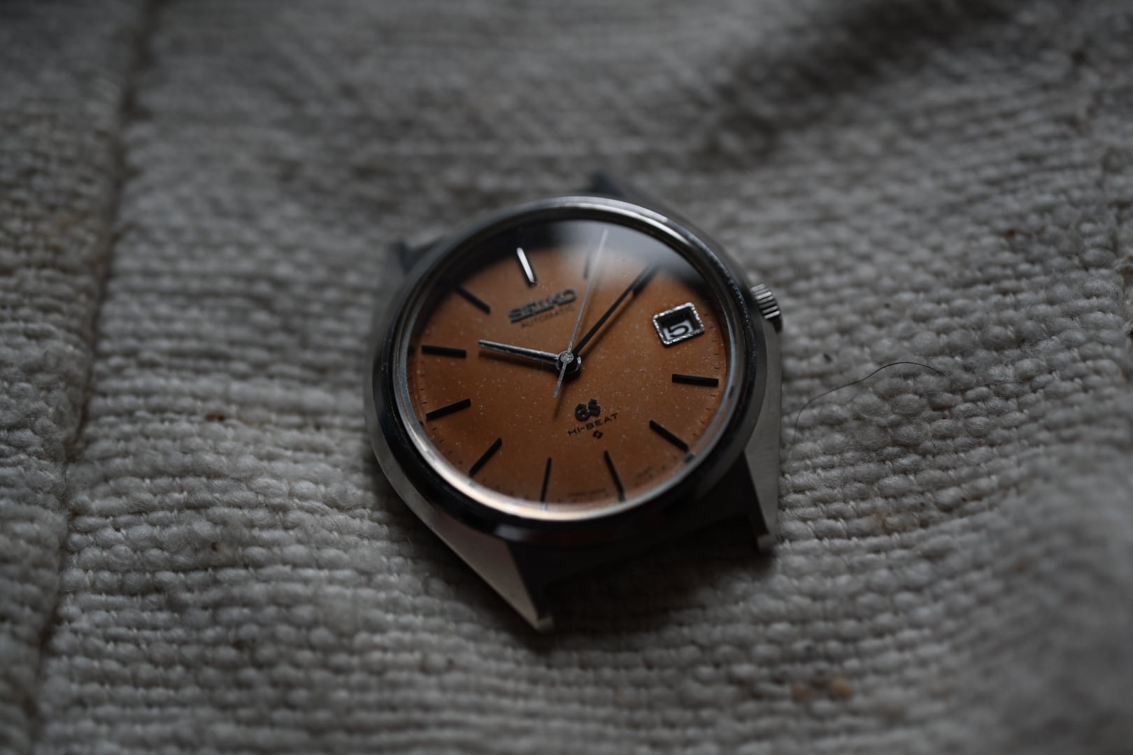 今回ご紹介するのは 1970年製造のセイコーです。 サイズ・スペック サイズ(サイズ・スペックの規格に関してはサイズ規格ページをご覧ください) 縦:41.5㎜×横:37.5㎜ ラグ幅:18㎜ 厚さ:9.2㎜ 着用モデル:店主 腕周り15㎝程 スペック 駆動方法:機械式(手巻き) 防水能力:非防水 国産腕時計の雄、セイコー。 その中でも高級ラインとして販売されていたのがキングセイコーです。 外装の造形はセイコー独自の デザイン理論: セイコー・スタイルを踏襲。 二次曲面を取り入れた 明瞭なカッティングに、 60年代後期~70年代に流行した Cラインケースを採用。 スイス製時計にはない、 鋭いエッジ(=縁)を持つ 時計に仕上がりました。 ポリッシュ(再仕上げ)は行われておらず 外装ケース、文字盤、裏蓋、 メダリオン(ゴールド)に 当時の色味やシルエットが 確りと残る貴重なコンディションを 維持しています。 45系をお探しの方にはオススメです。 ムーブメントには 名作と名高いCal.45系を搭載。 ハイトルクの力強いゼンマイと 高い振動数によって 本番スイスのコンクールで スイス製時計を打ち負かした 伝説的な機械です。 かなりピーキーな機械として知られ、 あまり初心者の方には おすすめしてきませんでしたが ご希望でしたら、 安心してお使い頂けるよう サポート致します。 その機械にスポットが 当たることが多いものの、 外装や文字盤に 秘められた設計にも注目です。 こちらは専門の業者にて オーバーホール(分解清掃)を 行った後の納品となります。 納期を1.5ヶ月頂戴します。 当店規定の 半年間動作保証が付きます。 詳しくは当店のInstagram もしくは、ご購入時に お渡しする保証書をご参照ください。 何かご不明な点がございましたら お気軽にお問い合わせくださいませ。