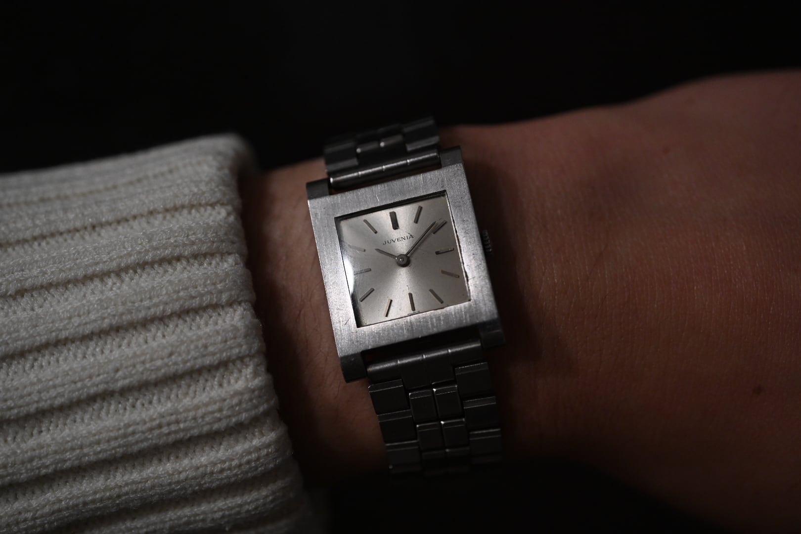 今回ご紹介するのは1960年代後半製造のシーマ・グラフィックです。 サイズ・スペック サイズ(サイズ・スペックの規格に関してはサイズ規格ページをご覧ください) 縦:32.4㎜×横:26.2㎜ ラグ幅:17㎜ 厚さ:9㎜ スペック 駆動方法:機械式(自動巻) 防水能力:非防水 ドイツのデザイン理論である”バウハウス”を忠実に体現する1960年代後半製造の時計です。 このグラフィックは、元々同じスイスメーカーであるDoxa(ドクサ)がリリースしたモデルで、Doxa、ernestborel そしてCymaの3社が共同設立したSynchron体制が始まる前後に2社で販売されていました。ケースの素材、文字盤のデザインが複数存在する面白いラインです。 Cyma Graficが誕生したのは、1960年代後半。この頃世界的にアールデコデザインに注目が集まっており、直線や曲線を多用した時計が多く打ち出されていました。デザインの流行は20年周期で回っていると一般的に言われており、アールデコとそれにルーツを持つバウハウスデザインはこの時代に脚光を浴びていました。 この個体を見ると分かりますが、時刻表示は至ってシンプル。時刻の読み取りやすさを一番に考えたレイアウトで、背の高い植字インデックス、バータイプの針、放射状のラインで構成されています。 一見シンプルで変哲もない時計に見えるものの、カレンダー位置はブランドロゴの対称に配置されていたり、インデックス上部に黒いエナメル塗装が施されている等々、時間を読むことだけでなく、美しさや対称性にこだわりを持った時計であることがわかります。単にシンプルなだけではなく、意味のあるデザイン。まさにバウハウス理論を具現化した時計です。 この個体に関しては以下のコラムで大変詳しく解説していますので是非ともご覧ください。 https://jwatchman.base.shop/blog/2024/06/05/232643 一般的にスクエア(角型)の腕時計は、角がある分余白が少なく、ラウンド(丸型)の腕時計よりも大きく見えます。そのためサイズ感には注意する必要があります。特に日本人は手首がスリムで、角型の時計は持てあましてしまうことが大半です。この個体は縦の幅が33㎜弱と非常にコンパクト。更に横幅もそれに近い大きさであるため、上品に着けこなすことが可能です。 こちらは専門の業者にてオーバーホール(分解清掃)を行った後の納品となります。納期を1.5ヶ月頂戴します。当店規定の半年間動作保証が付きます。詳しくは当店のInstagramもしくは、ご購入時にお渡しする保証書をご参照ください。 何かご不明な点がございましたらお気軽にお問い合わせくださいませ。